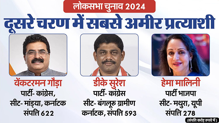 दूसरे चरण में सबसे ज्यादा संपत्ति घोषित करने वाले शीर्ष तीन उम्मीदवारों में पहले स्थान वेंकटरमन गौड़ा हैं। कर्नाटक की मांड्या सीट से कांग्रेस प्रत्याशी गौड़ा के पास 622 करोड़ से अधिक की चल और अचल संपत्ति है। दूसरे स्थान पर कर्नाटक की बेंगलूरू ग्रामीण सीट से कांग्रेस प्रत्याशी डी.के. सुरेश हैं, जिनके पास 593 करोड़ से अधिक की संपत्ति है। तीसरी सबसे धनी प्रत्याशी हेमा मालिनी हैं। मथुरा लोकसभा सीट से भाजपा प्रत्याशी हेमा मालिनी के पास 278 करोड़ से अधिक की चल और अचल संपत्ति है।